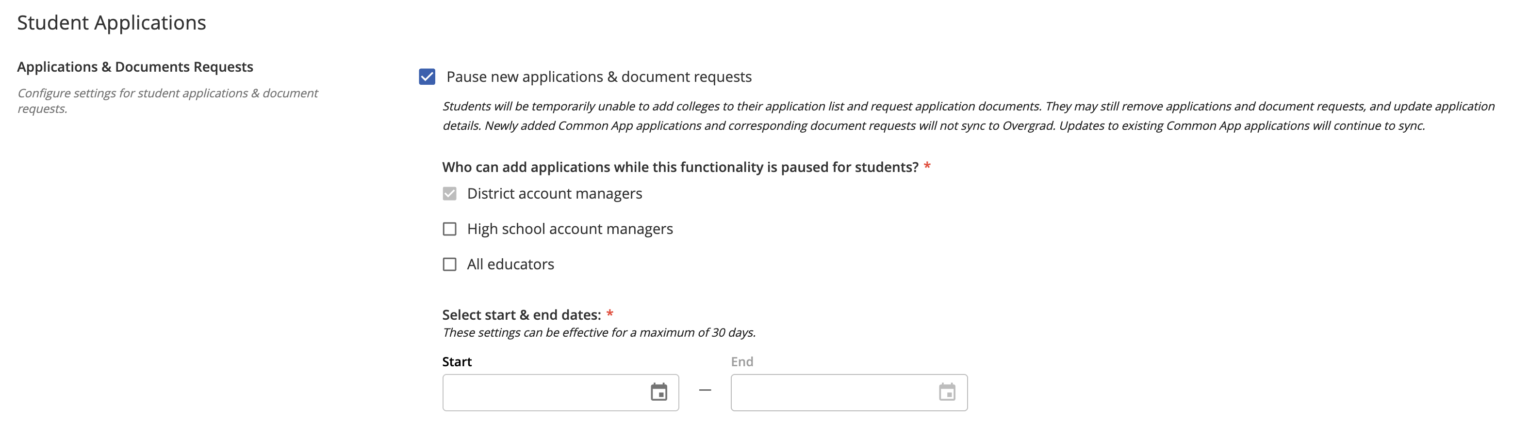 Pausing the addition of new applications and document requests for students primarily functions to allow educators to catch up on pending document requests and set deadlines for requesting addition documents or letters.