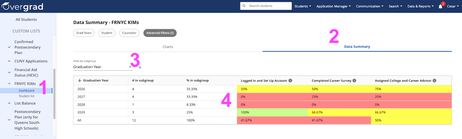 - Adjust the subgroup you would like to view data by. (Common selections include Graduation Year and Assigned Counselor.)