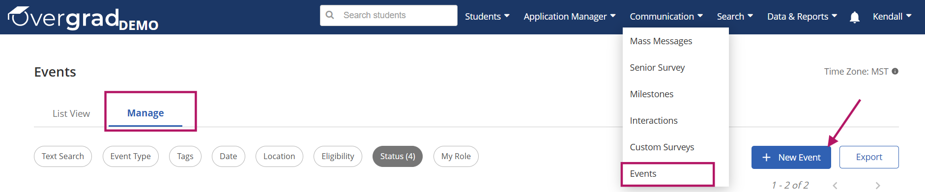 To create a new event, select the Communication menu from the top navigation bar and then select Events. Once in the Events feature, select the Manage tab in the top left. Then click the blue + New Event button on the top right.
