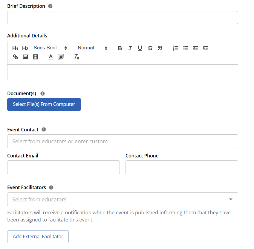 - Event Facilitators: Assign educators from your school who will help run the event - they will automatically receive a notification when the event is published