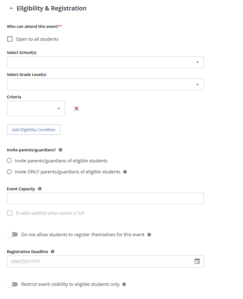 This section controls who can attend the event and how registration is managed. You must either select Open to all students OR include more specific eligibility such as schools, grade-levels or advanced criteria: