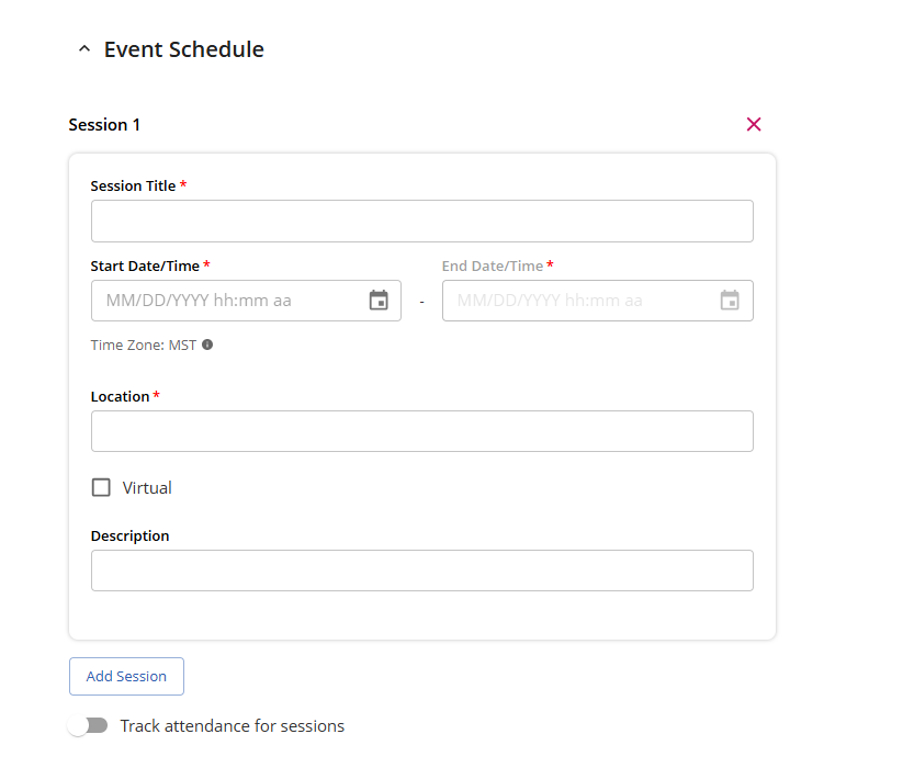 This is an optional section to use if your event has multiple sessions or breakout segments. Click Add Session to get started. Similar to your main Event Details, each session has its own Session Title, Start and End Date/Time, and Location (with a Virtual checkbox option). An optional Description field is also available for session-specific notes. You can add as many sessions as needed.