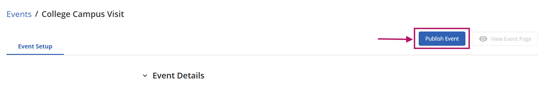 Once all required fields are complete and final, click the blue Publish Event button on the top left to make the event visible to students and/or parents.