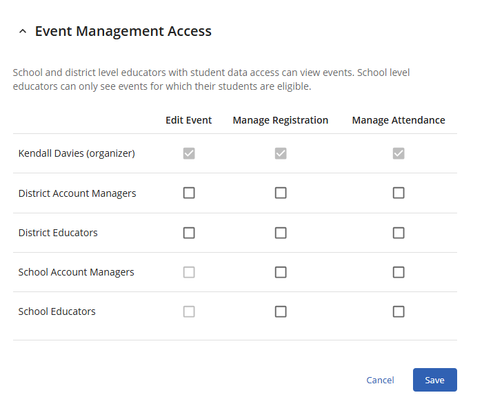 - Manage Attendance: Users with this access will have the ability to take attendance for the event.