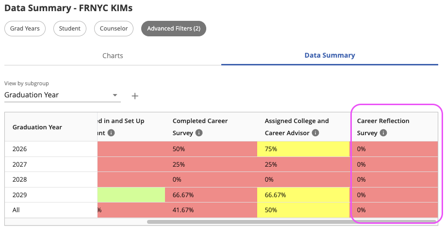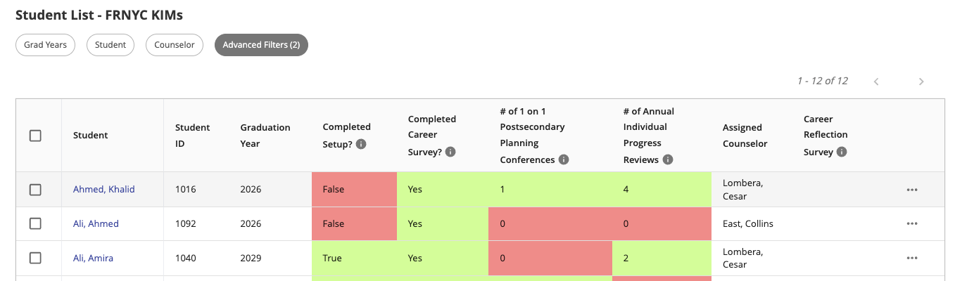 For FRNYC progress specifically, educators can refer to the existing FRNYC KIMs custom student list. A column has been added that will reflect the status of each student that is tagged as FRNYC and a new calculation has been added to the Data Summary in the dashboard.