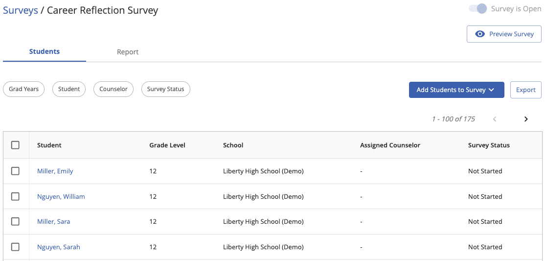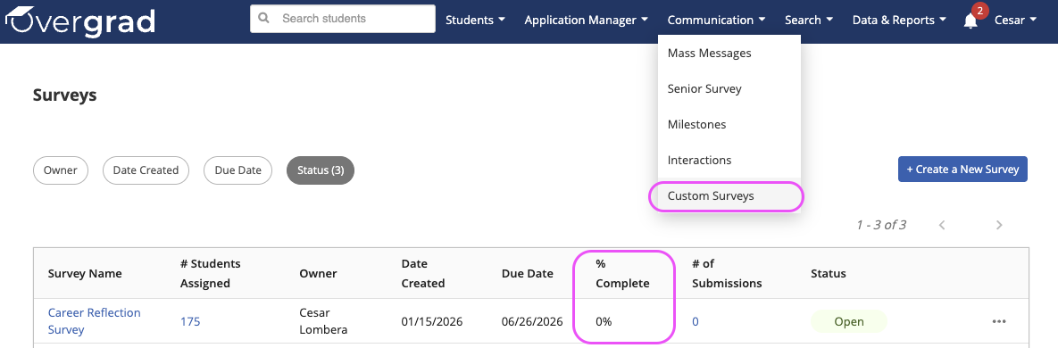 For overall student progress and to review results, educators can navigate to Communication -> Custom Surveys. The table will show overall completion and clicking into the survey name will allow the viewing of results and an exportable list of individual student progress.