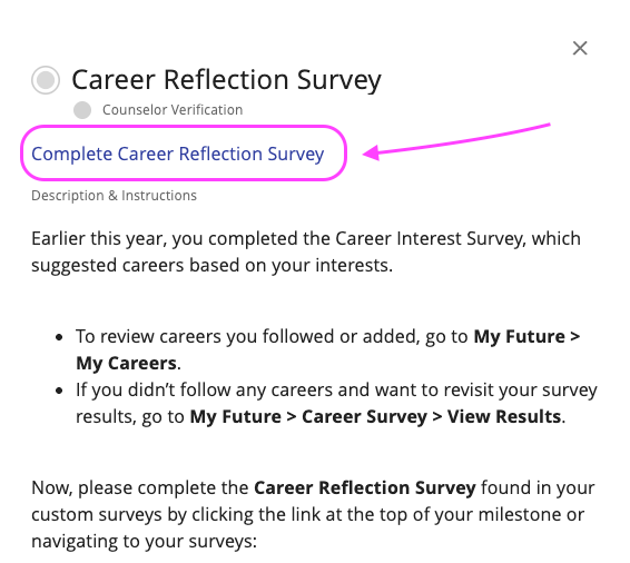 A milestone was created across grades 9-12 that directs students to complete the Career Reflection Survey. The start date of the milestone is 1/27 and the end date is 6/26. Start date simply means it stops being greyed out, but it is still accessible prior to that date. The start date is based on the official start of spring semester and the end date is based on the last day of class for students.