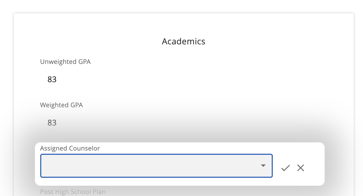 This field will be uploaded to the STARS College and Career Planning tracker based on the “Assigned Counselor” field in Overgrad.