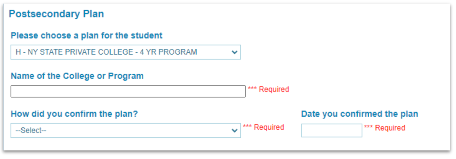All Postsecondary plan fields must be completed before they will be successfully uploaded to STARS. Incomplete entries (i.e, missing a verification date or program name, etc) will not be uploaded to STARS.