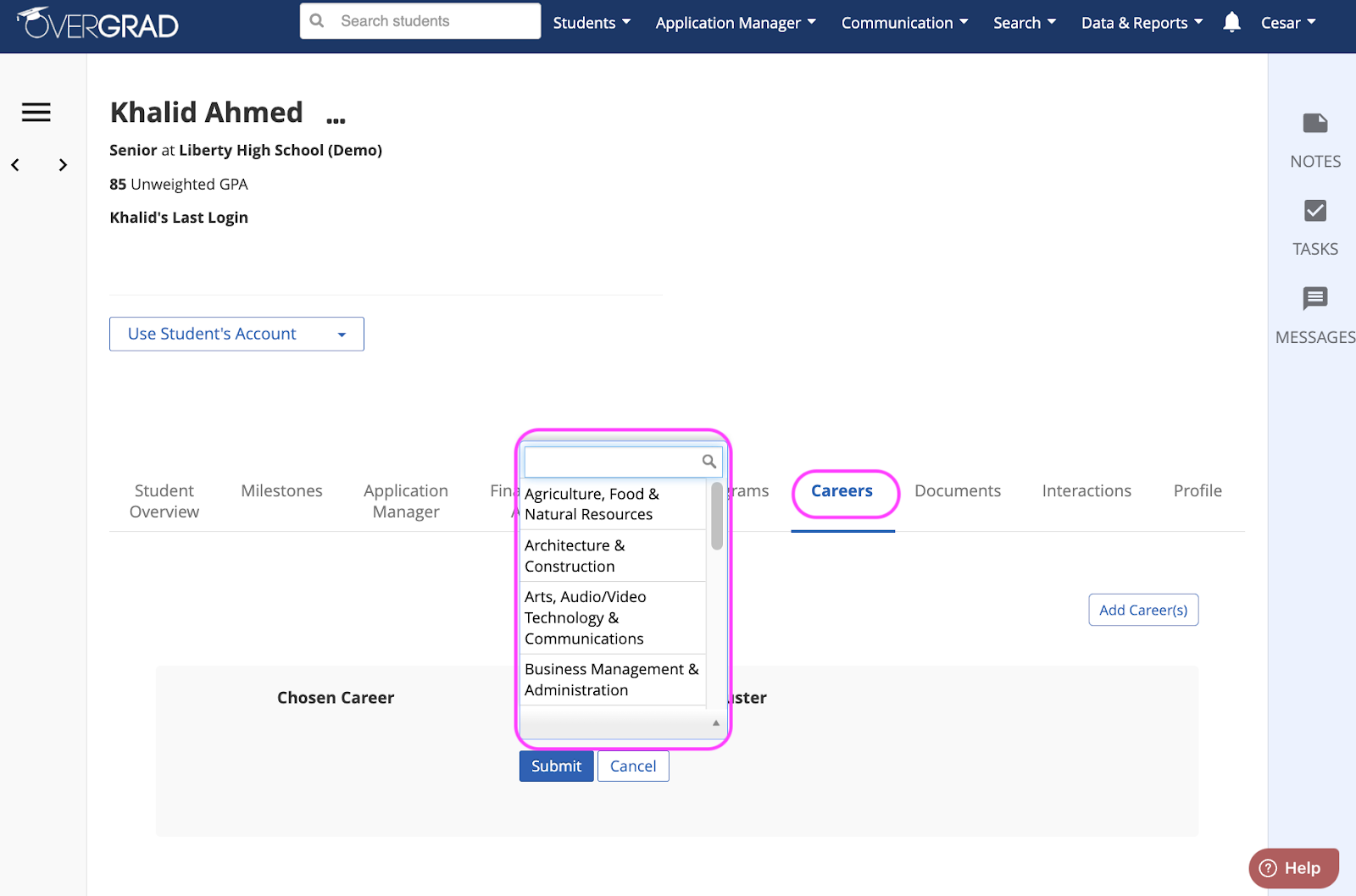 For Educators, this field can be logged from the Career tab of an individual student’s profile page.
