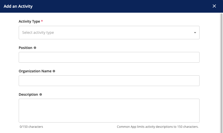 - Description Describe what you did, any accomplishments, and recognition you received. Common App limits activity descriptions to 150 characters, so keep it concise and impactful. A character counter will help you track your length.