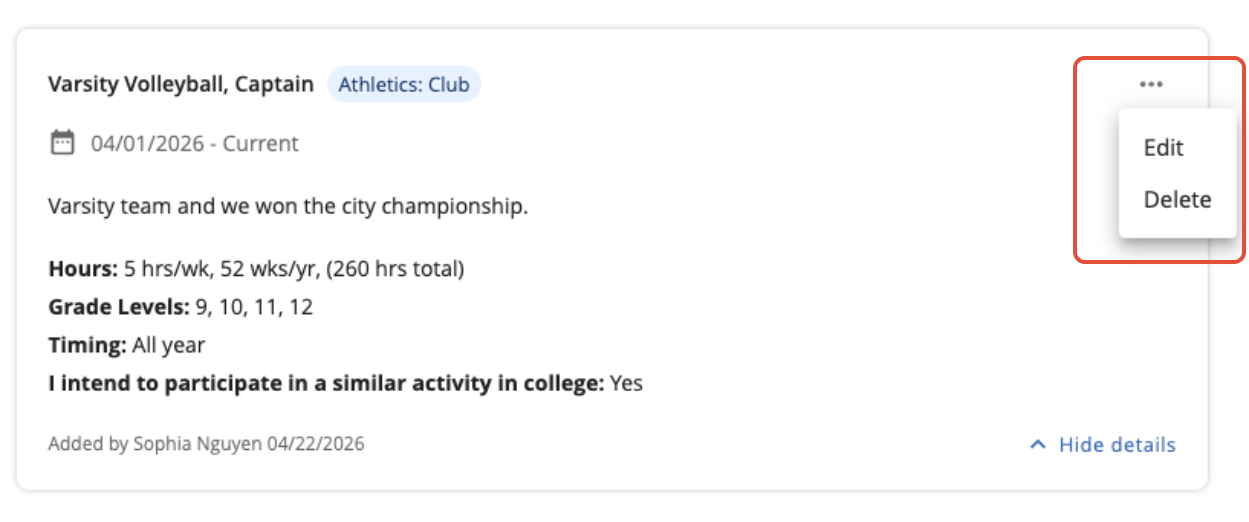 The Activities section is where you build and manage your personal list of extracurricular activities, jobs, volunteer work, and other involvement. Keeping this up to date helps you stay organized and makes it easier to fill out college applications, especially Common App, which asks you to list your activities and describe your role.
