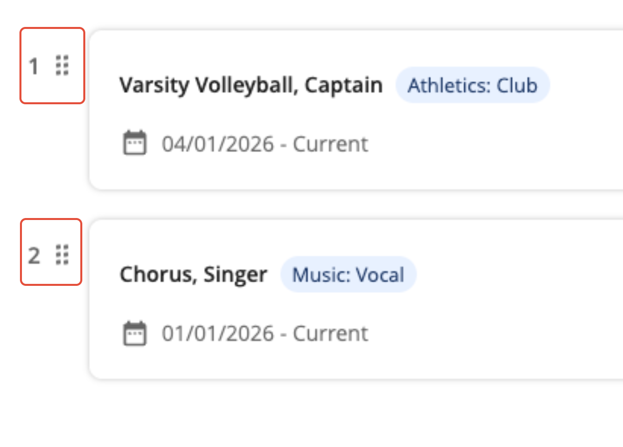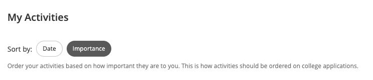 Applications like Common App ask you to list activities in order of importance to you. You can drag and drop your activities to arrange them in that order.