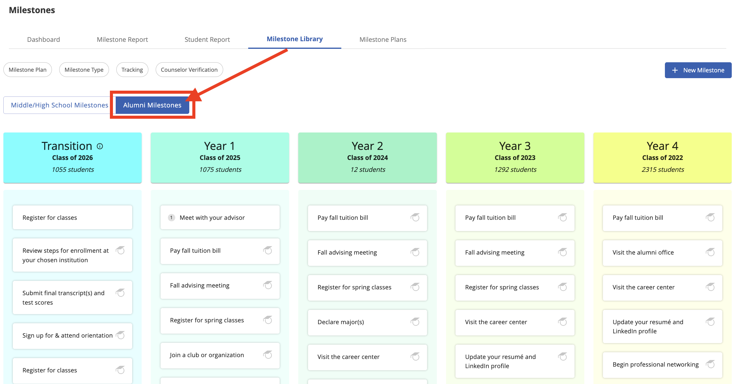 Alumni Milestones extend the Milestone system into the postsecondary years so that assigned counselors can track and support students through enrollment, persistence, and completion. Because postsecondary journeys don't follow a neat calendar — gap years, stop-outs, and transfers are common — Alumni Milestones are sequenced by number of years since high school graduation rather than by graduation year.